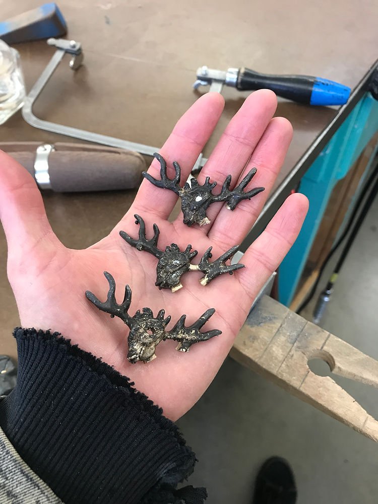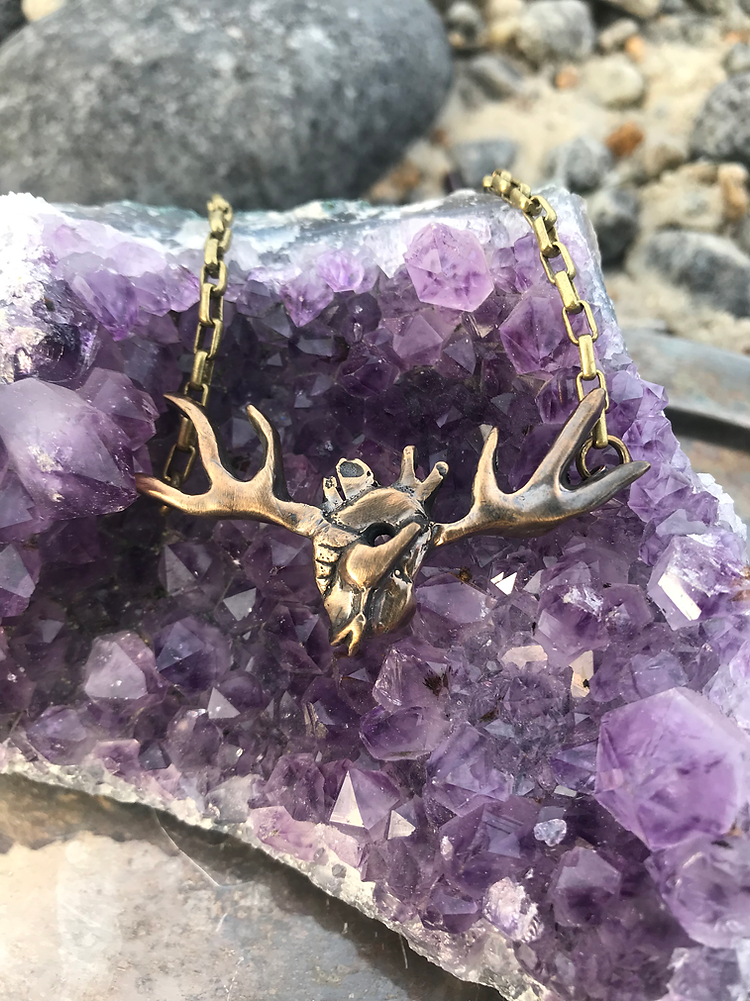 This is a malliable renditon of my logo. Anatomical heart with antlers. Lost wax casted. Bronze. Lays near collar bone, with a 1″ chain extender. Chain varies,