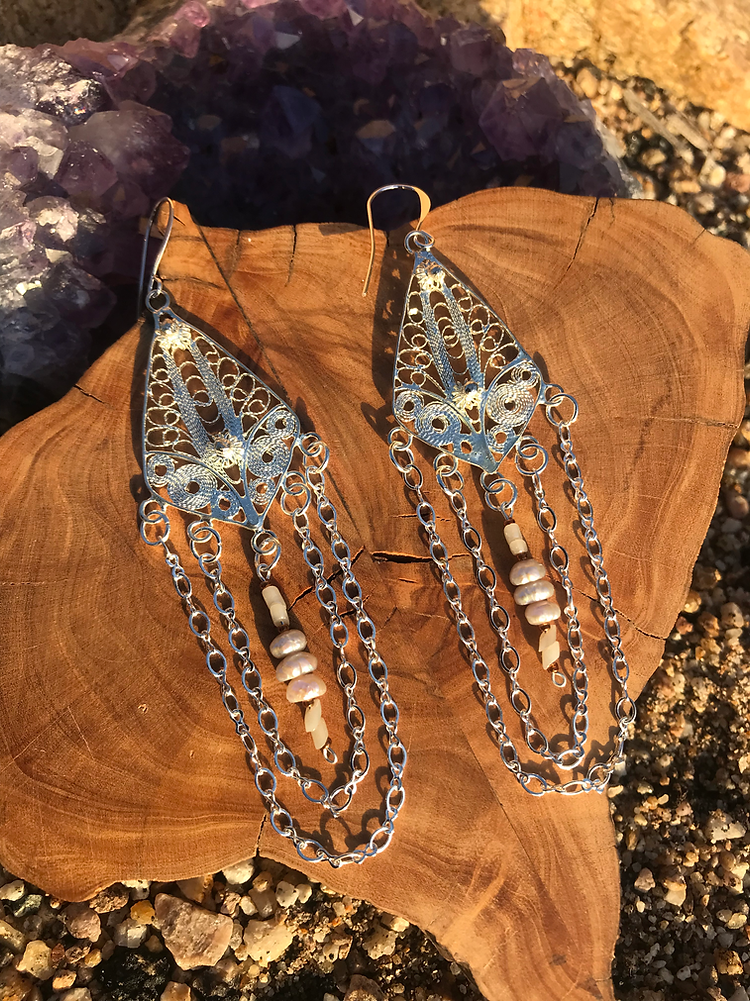Stunning Silver plated filigree earrings. Chandelier style with silver plated chain, findings, and ear wires. Adorned with fresh water pearls, these are a sparkly addition to any outfit!