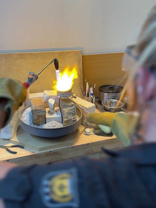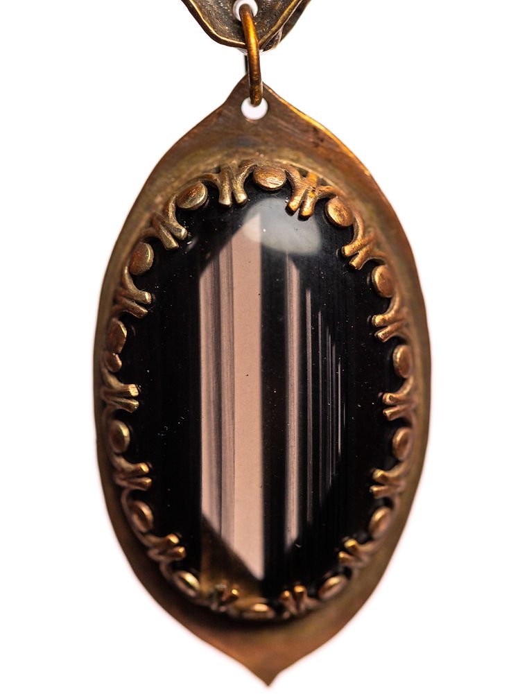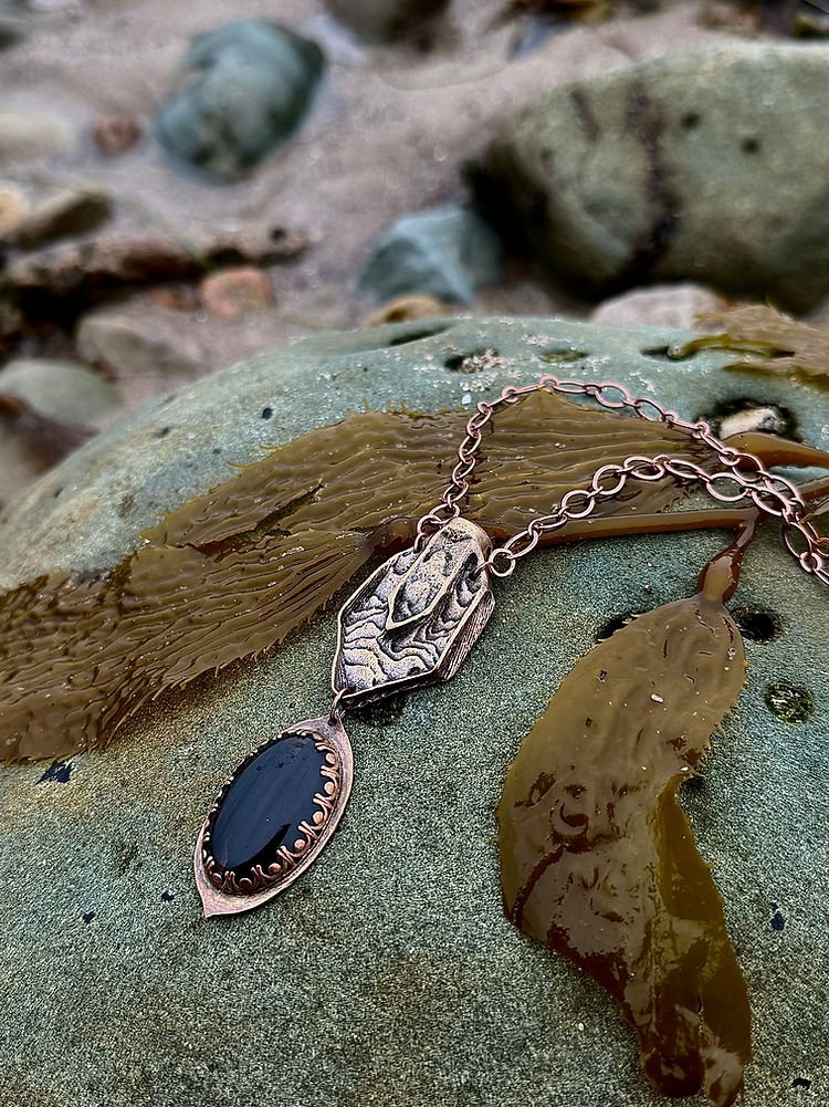 Made with the cuttlefish bone casting technique, this necklace pendant is a unique piece to adorn oneself with. It is cast in bronze, has a Midnight Lace Obsidian stone setting, and has a brass chain and findings. Because the cuttlefish bone is typically a one-time-use mold, this piece is one of its kind.
