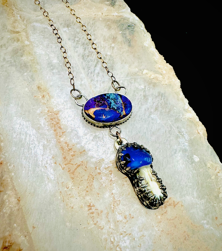 Fabricated Mojave Purple Turquoise necklace pendant with a blue glass blown dangling mushroom. Glass blown mushroom blown by artist Polly Toombs. Many precious stones and different sized/colored glass blown mushrooms are available for custom orders. Set up a conference call with Reba to discuss your preferred precious stone and color of mushroom for custom designs.
