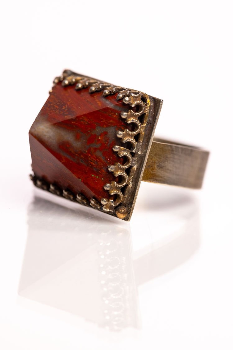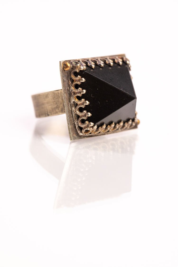 Fabricated pyramid ring with bronze granulation. Onyx, Red Adventurine (shown), Green Aventurine (not shown), Lapiz (not shown) are available.