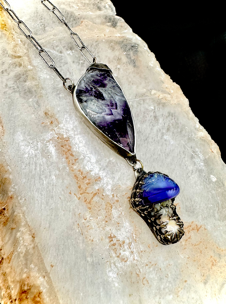 Fabricated Chevron Amythyst necklace pendant with a blue glass blown dangling mushroom. Glass blown mushroom blown by artist Polly Toombs. Many precious stones and different sized/colored glass blown mushrooms are available for custom orders. Set up a conference call with Reba to discuss your preferred precious stone and color of mushroom for custom designs.