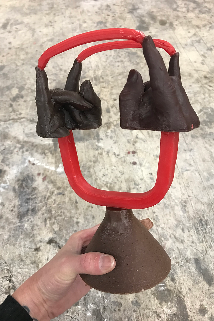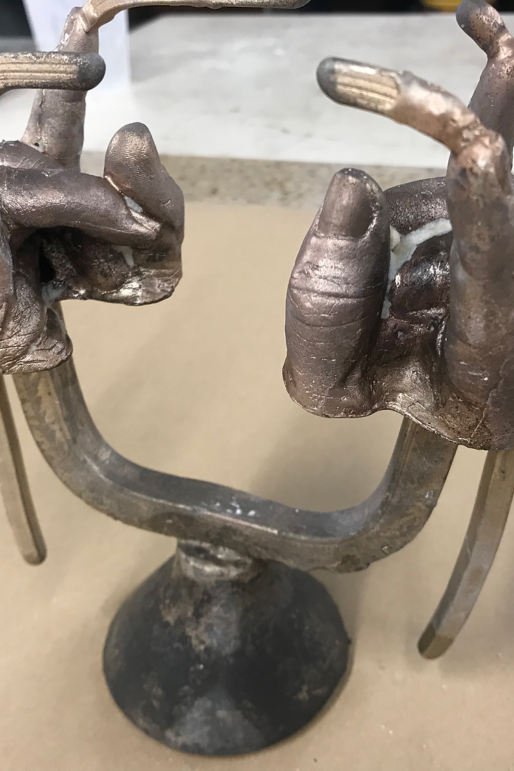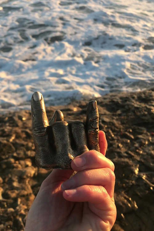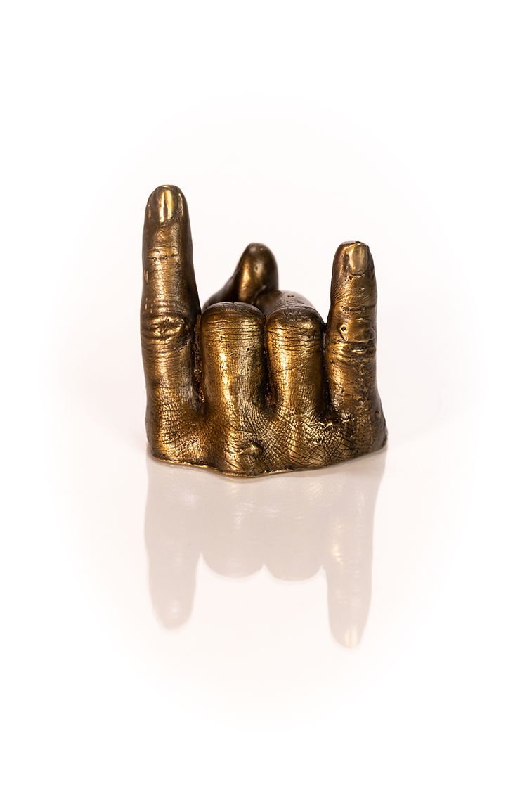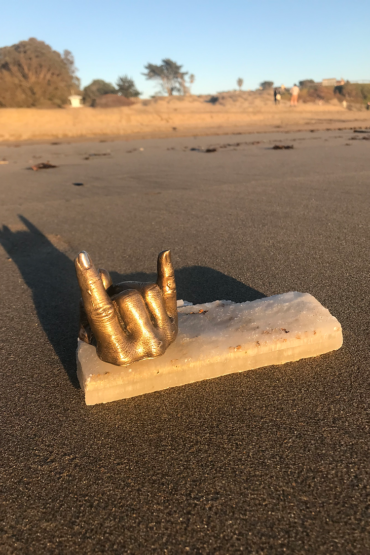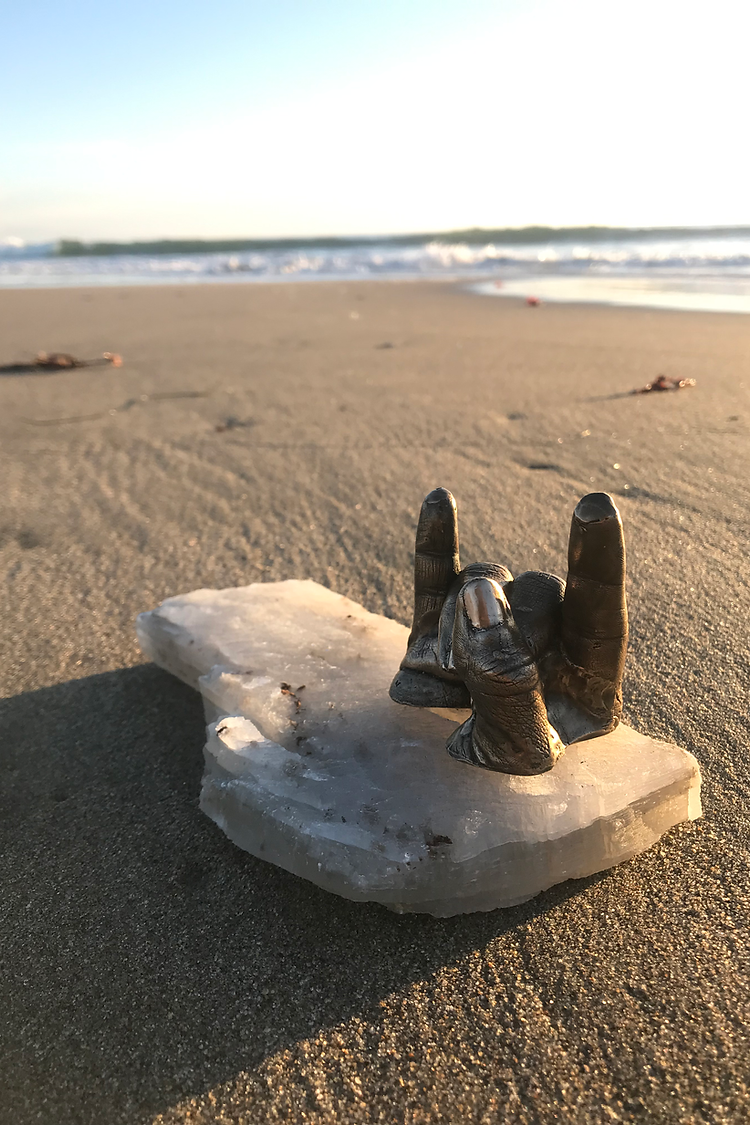 This lost wax casted bronze sculpture is a smaller rendition of my left hand. Life is full of strife and things to keep on a calendar. This little sculpture is a reminder to have a good time! Take a break, go dancing, jump in the ocean; whatever it is that makes you happy. Because we gotta continue to Rock On to carry on.