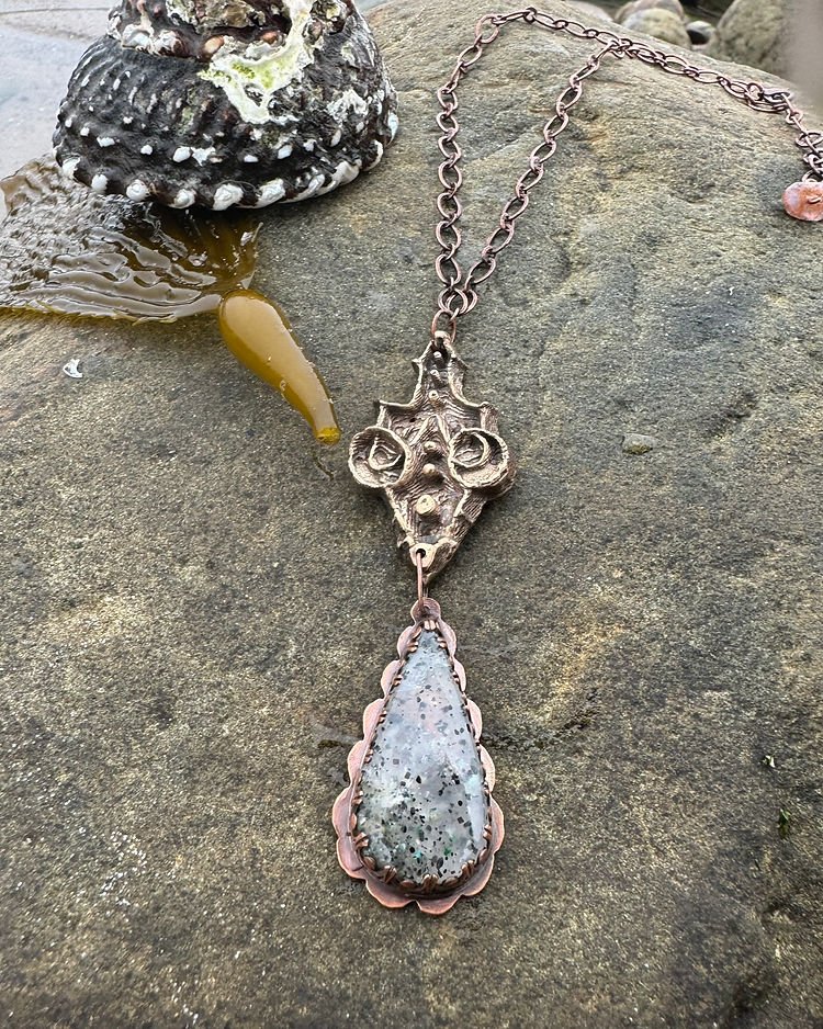 Made with the cuttlefish bone casting technique, this necklace pendant is a unique piece to adorn oneself with. It is cast in bronze, has a Black Dot Quartz stone setting, and has a brass chain and findings. Because the cuttlefish bone is typically a one-time-use mold, this piece is one of its kind.