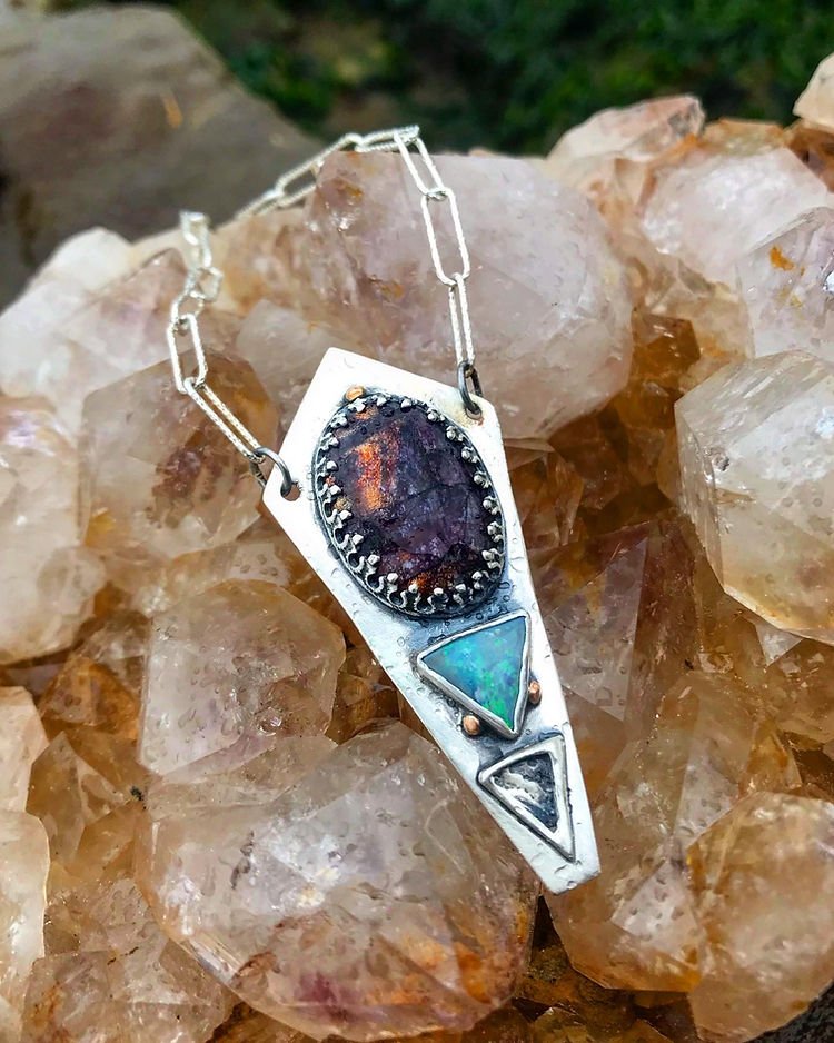 On the top we have Asteroid Jasper, beneath is an Australian Opal, on the very bottom is a casted triangle from a Cuttlefishbone casting, and bronze granulation. When there is a series of three, it represents balance. A triangle with a corner pointing down signifies water.